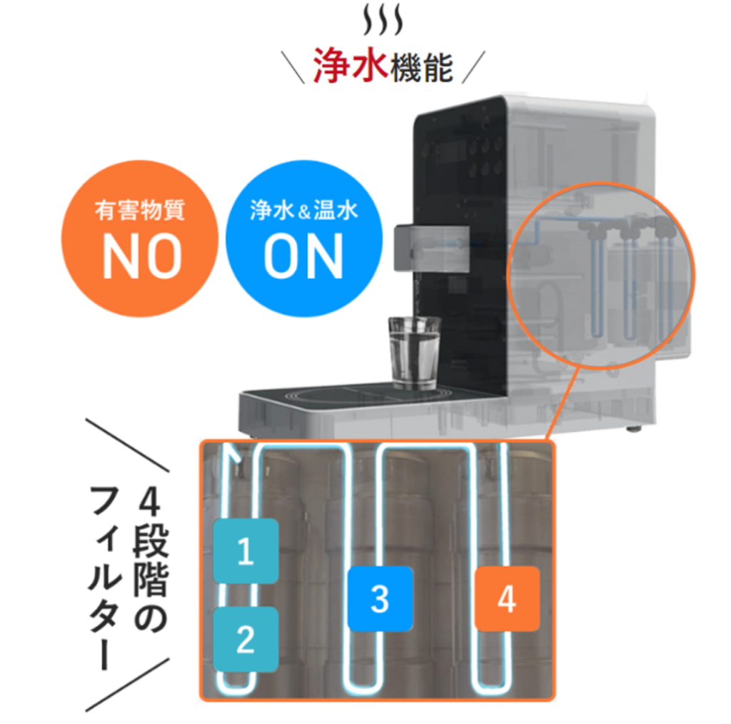 4段階フィルターでウイルス・バクテリア・重金属など有害物質を除去します。供給されるお水は全て浄水されたキレイなお水。調理だけでなく、給湯機能付き浄水器としてホットドリンクを作るのもおススメです。珈琲・紅茶で味の違いをお試し下さい。