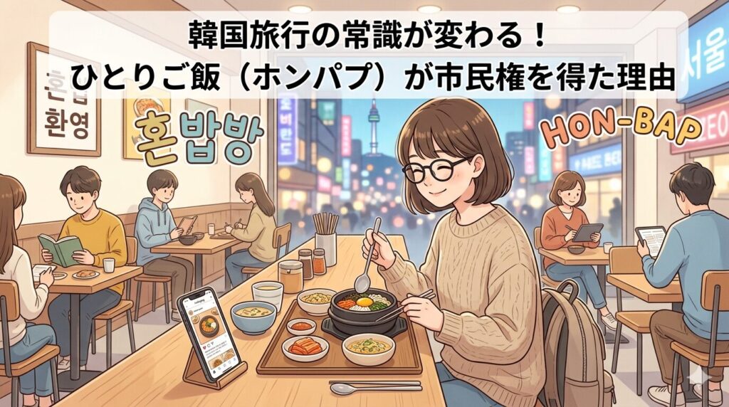 最近の若い世代を中心に急速に浸透しているのが、「ホンパプ(ひとりご飯)」「ホンスル(ひとり酒)」**というスタイルです。