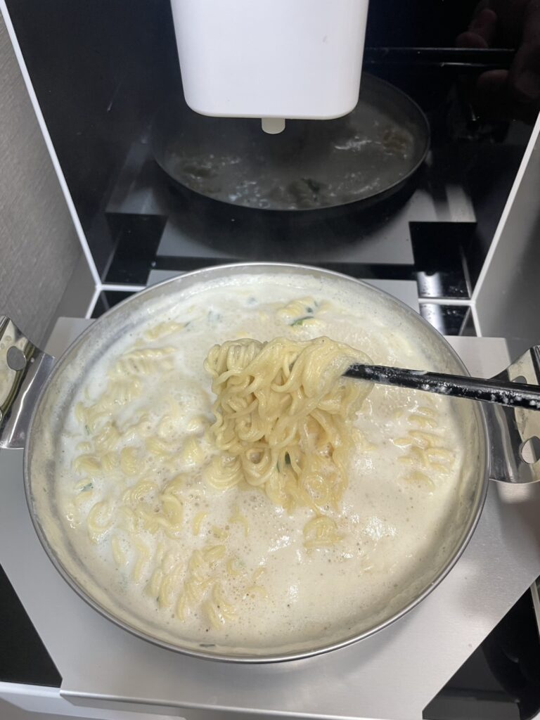 豆乳が味をまろやかにする上、とろみを加えてスープが麺にからみつく。