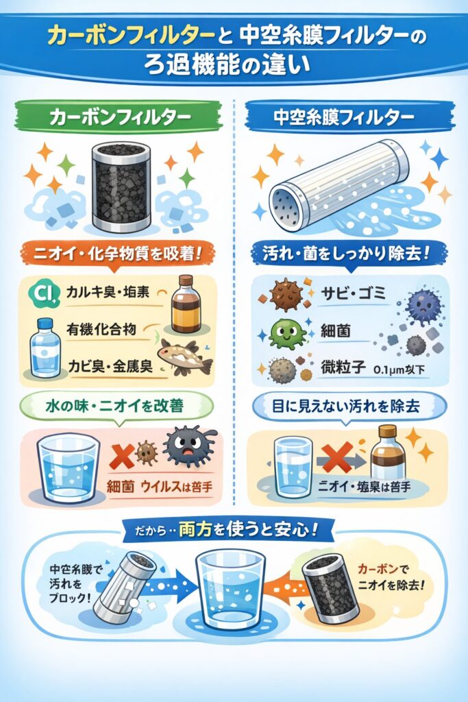 浄水機能 カーボンと中空糸膜 2種類のフィルターを使う理由