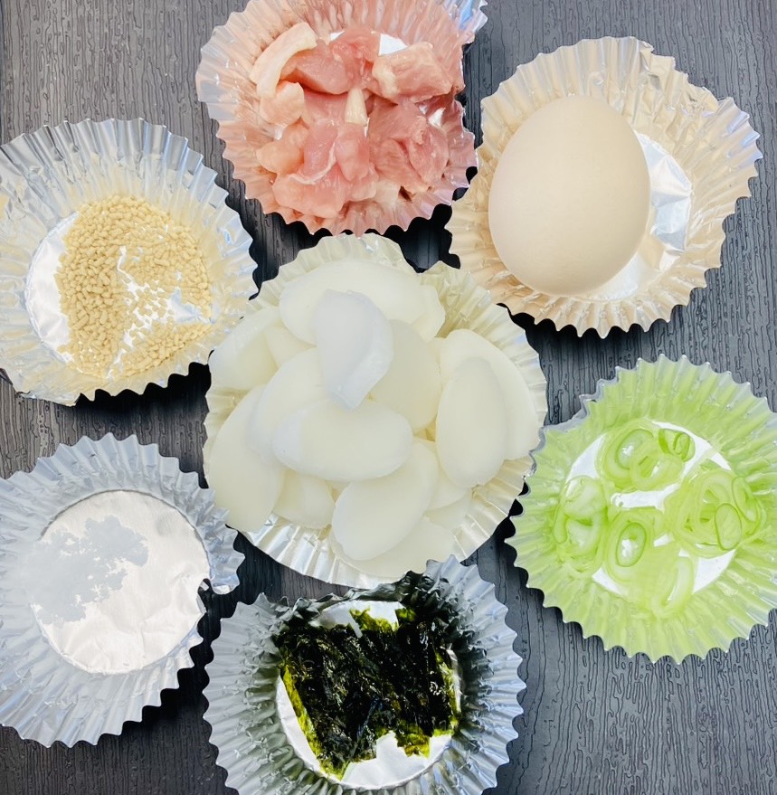 ①容器に餅、鶏肉、鶏ガラスープ少々を入れてスマートマルチクッカ―にセット