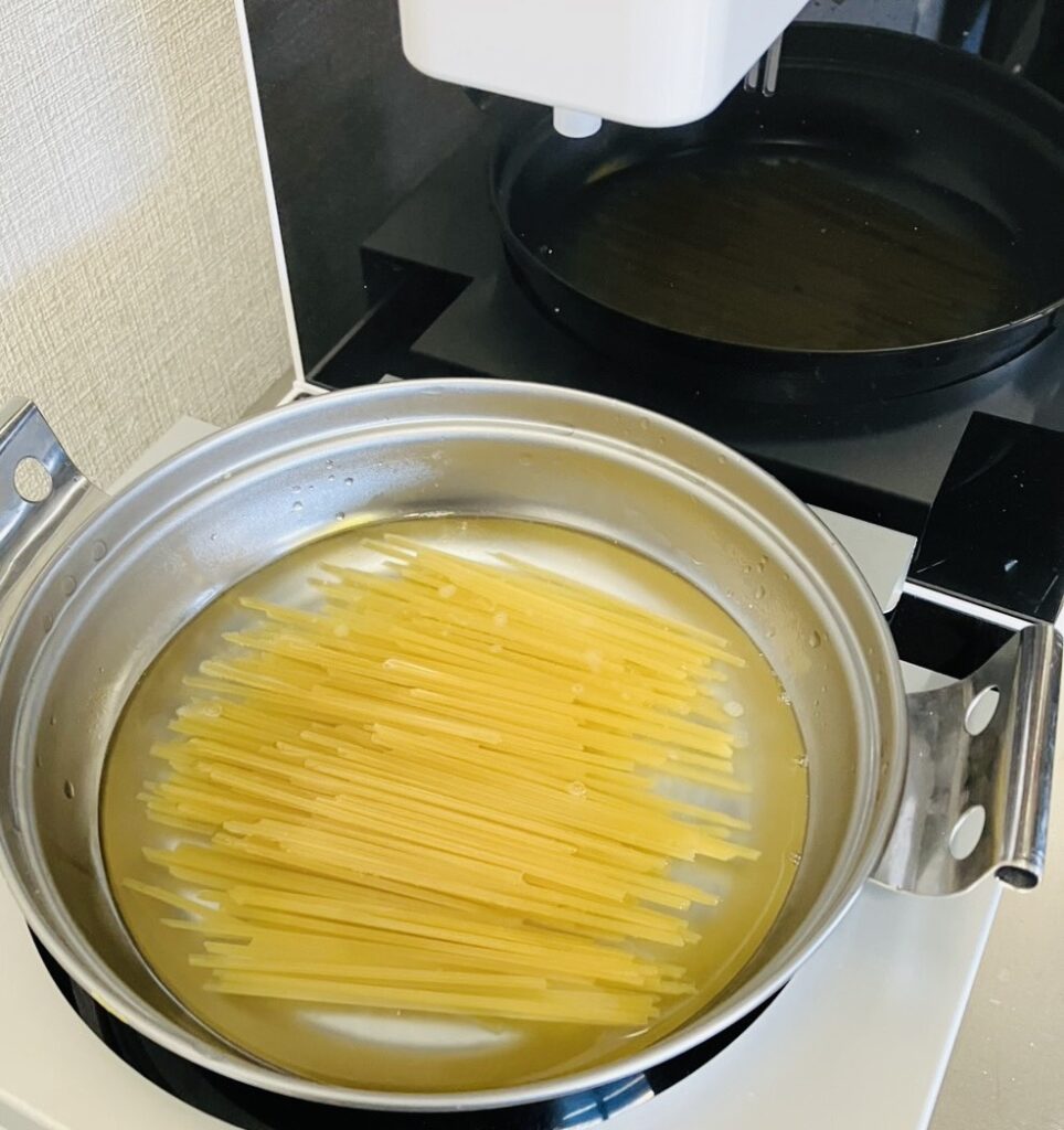 半分に折ったスパゲティと水を入れた小鍋をクッカーに置いて4分ぐらい煮た後おろしてお湯を捨てる。