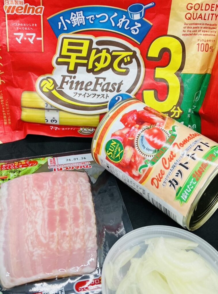 カットトマト、玉ねぎ ベーコン オリーブオイルを入れ混ぜながら炒める(約4~5分)塩、砂糖を好みの分量入れて出来上がり。