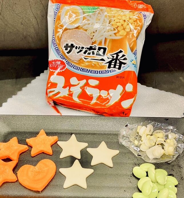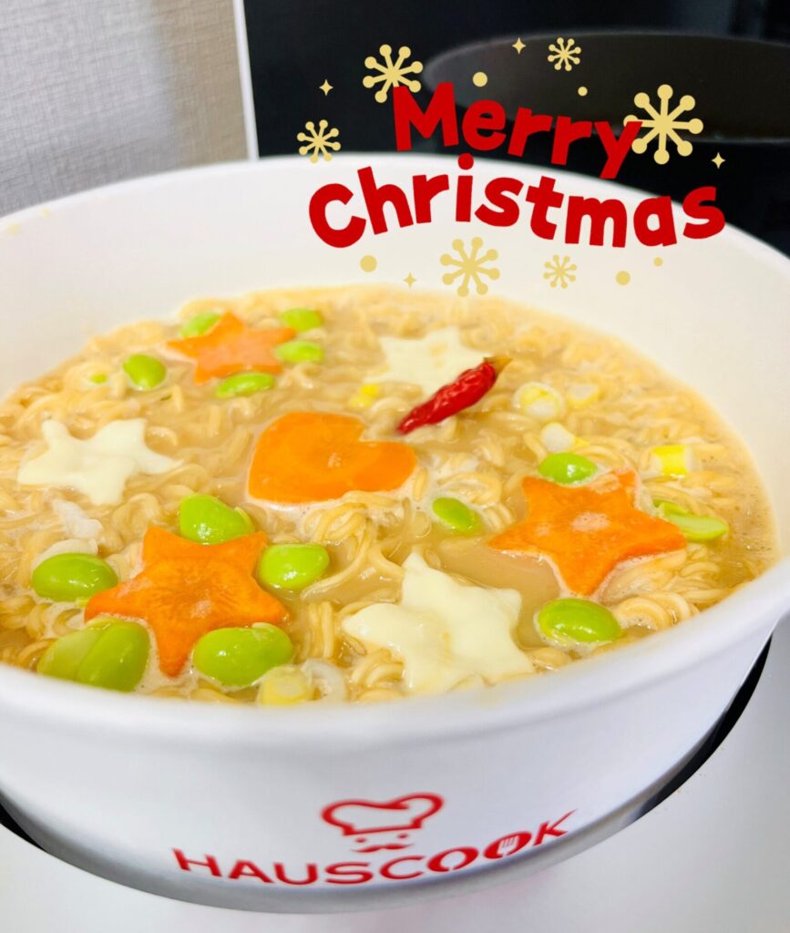 サッポロ味噌ラーメンをクリスマス風にトッピング👼💫。いつものインスタントラーメンも季節❄を感じる一品になりました。100円ショップで買った抜型で星やハートの形にくり抜いてのせるとなんとなく楽しい気分になります🕯🎅🎉